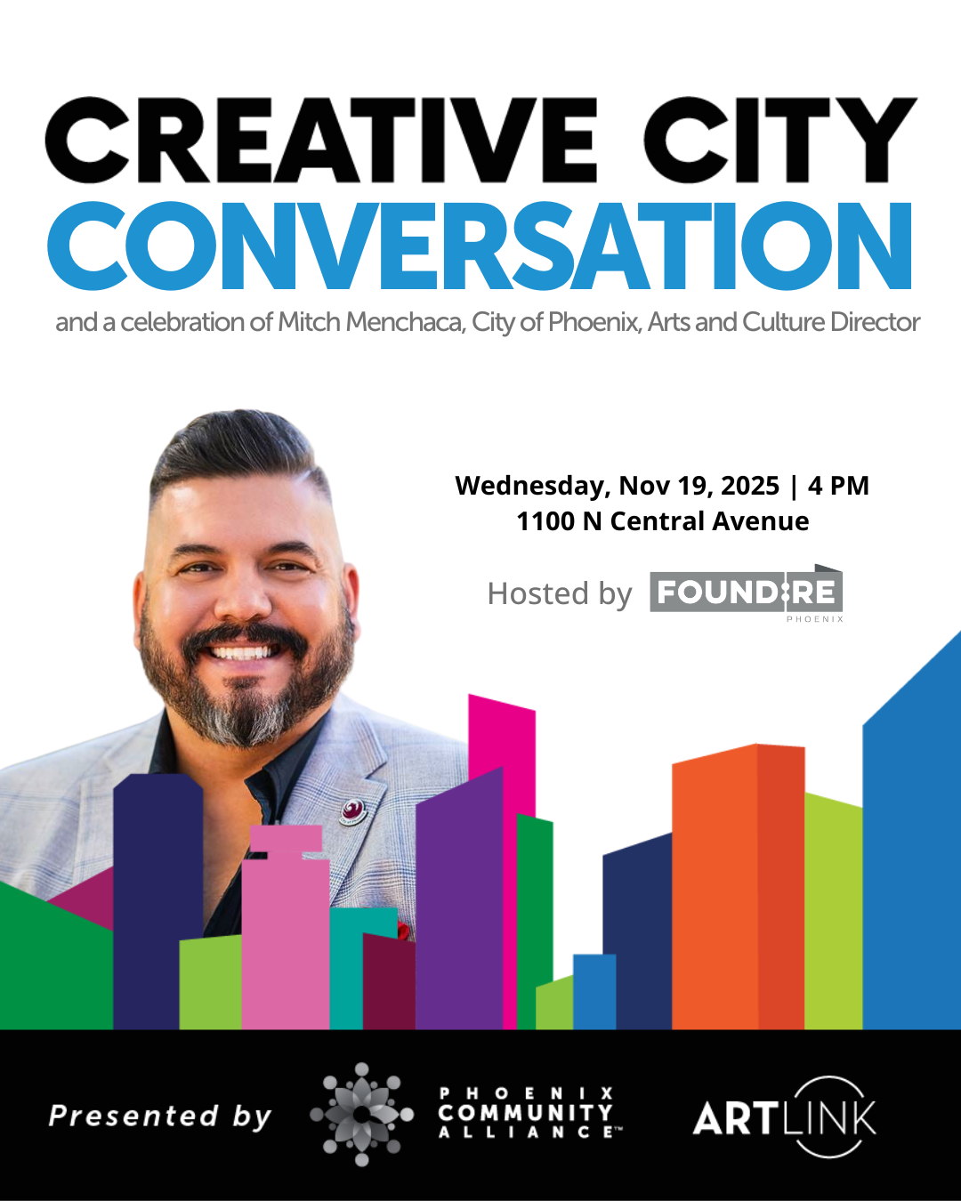 Engage in this celebratory and forward-looking event, a Creative City Conversation, on Wednesday, November 19, 4–6 p.m. at FOUND:RE Phoenix Hotel.
