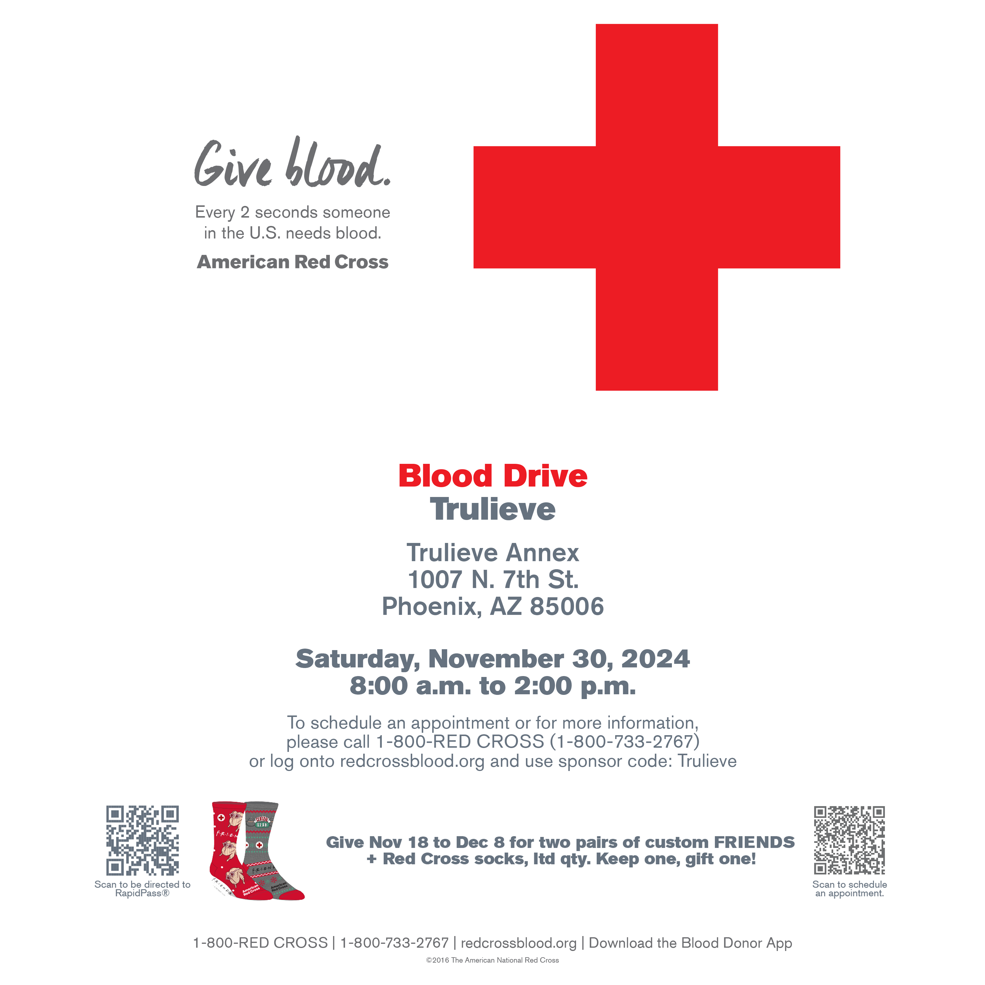 To schedule an appointment or for more information, please call 1-800-RED CROSS (1-800-733-2767) or log onto redcrossblood.org and use sponsor code: Trulieve. Give Nov 18 to Dec 8 for two pairs of custom FRIENDS + Red Cross socks, ltd qty. Keep one, gift one.