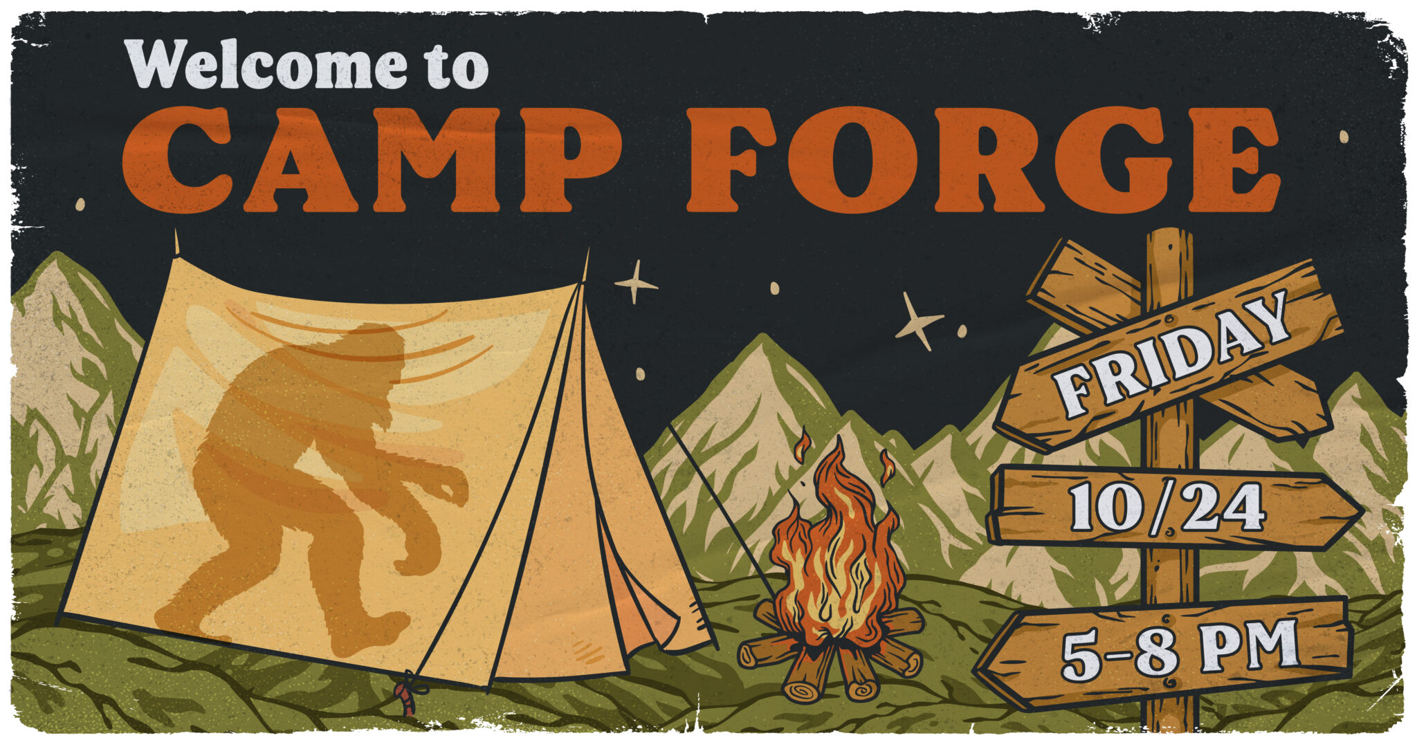 Bring your camping gear and a good ghost story to Camp Forge, our annual Halloween party, happening Friday, October 24th from 5-8PM.