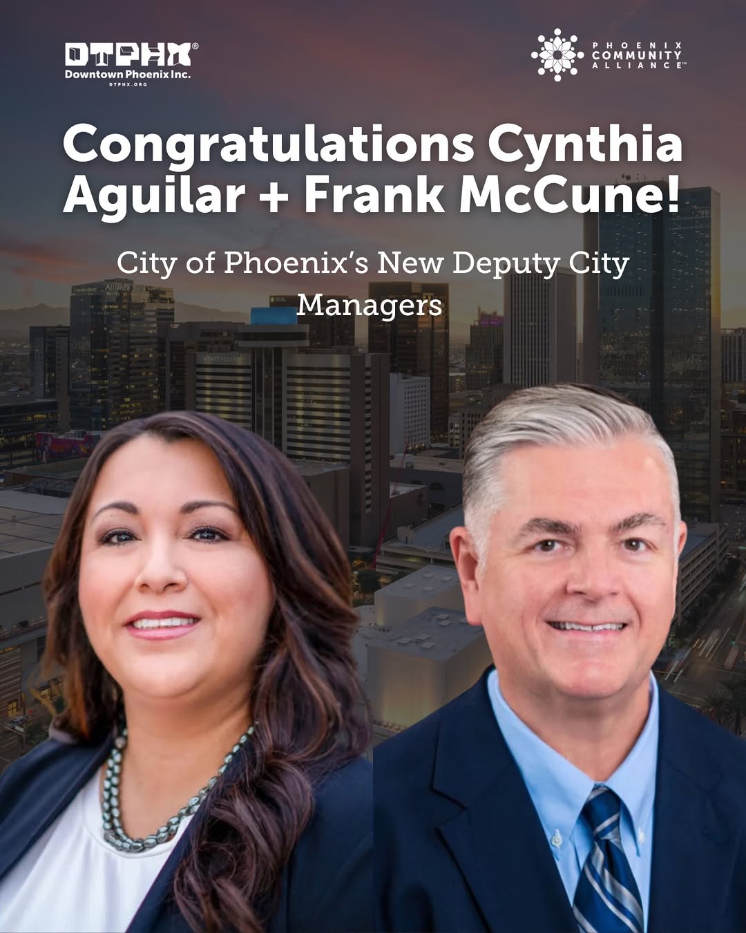Downtown Phoenix Inc. (@downtownphoenix) and Phoenix Community Alliance congratulate Cynthia Aguilar and Frank McCune on their appointments as Deputy City Managers for the @cityofphoenixaz.\n\nEffective and thoughtful leadership is foundational to building a Downtown that benefits the entire community. Cynthia brings a deep understanding of city operations shaped by years of public service, while Frank offers a collaborative, solutions-oriented approach rooted in his experience in government relations. Together, their leadership will help advance priorities that support economic vitality, livability, and long-term growth across Phoenix.\n\nAs partners invested in the success of Greater Downtown, we appreciate the opportunity to continue working alongside Cynthia and Frank to champion Downtown initiatives, strengthen the city core, and deliver positive outcomes for our community. \n\nWe wish them continued success in these important roles, and look forward to working with them in the years to come!